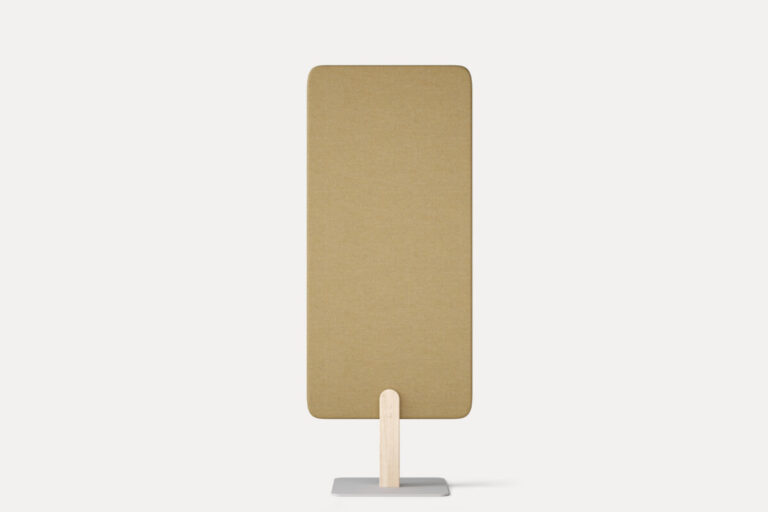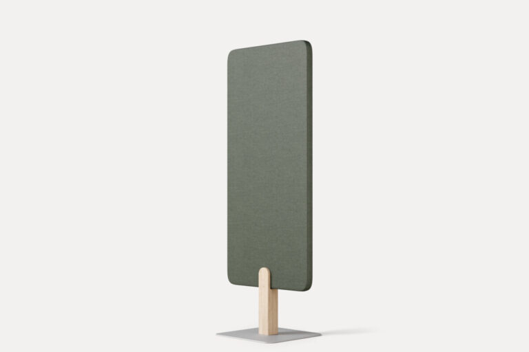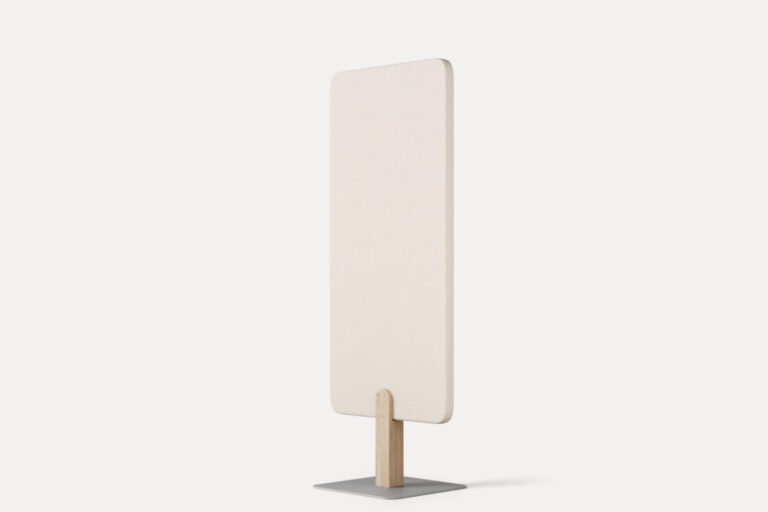 Sisu perforeeritud MDF ja kivivill, pealistatud kliendi valitud kangaga. Sirmi jalg puidust (valgeks peitsitud naturaalne saar), taldmik pulbervärvitud teras, RAL 7032. Garantii 20 aastat.